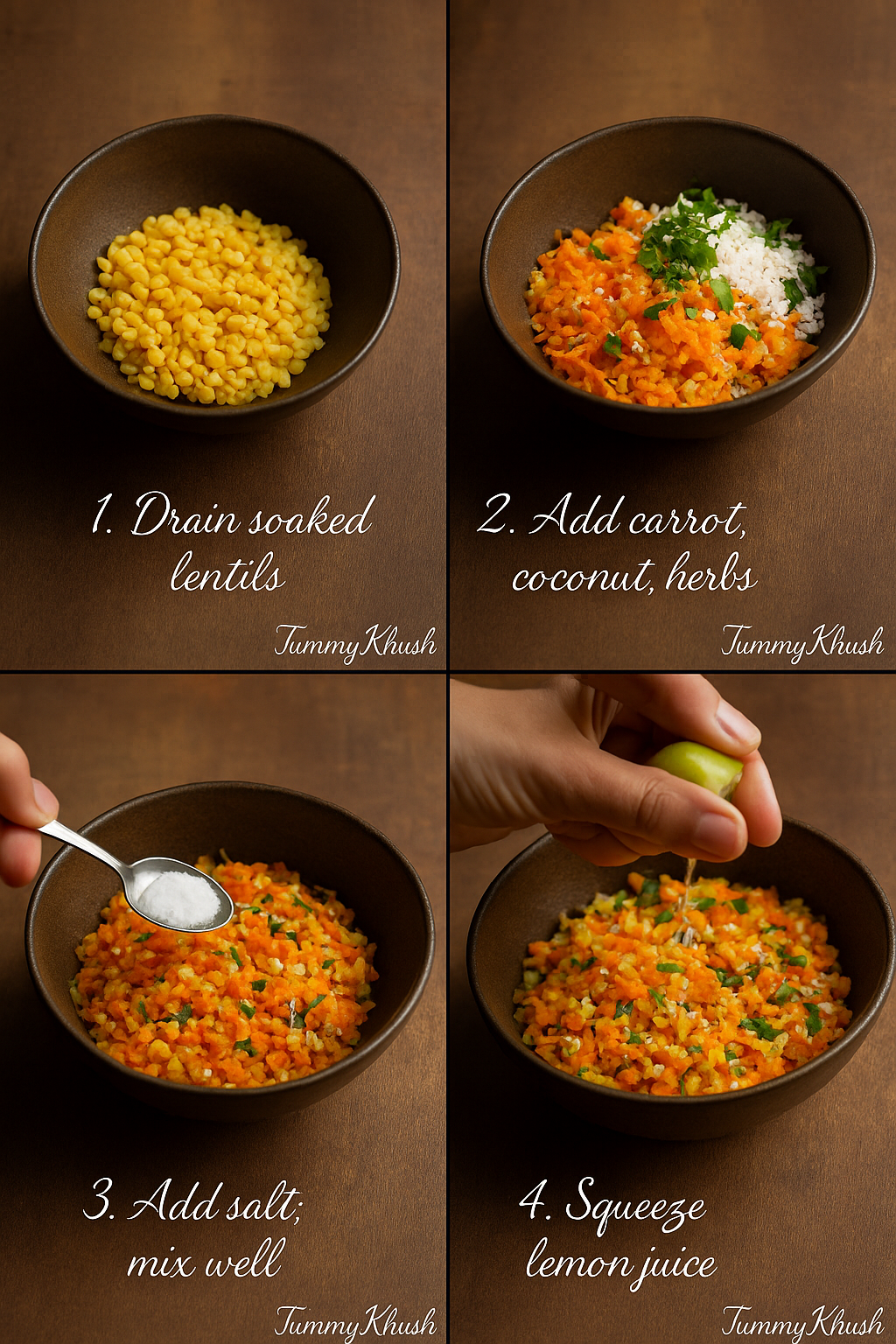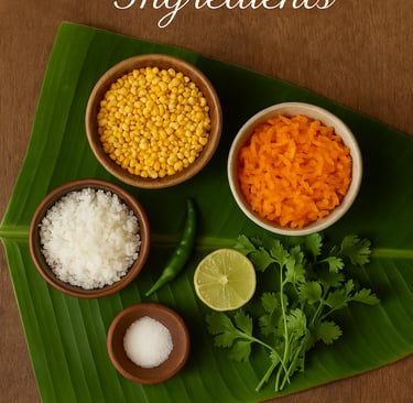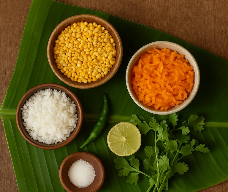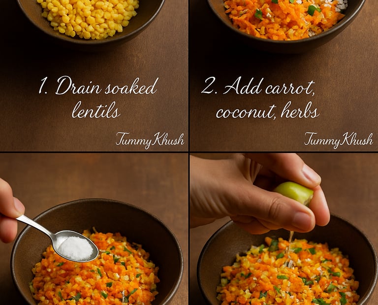 4. Combine: In a bowl, mix the dal, grated carrot, coconut, and coriander.